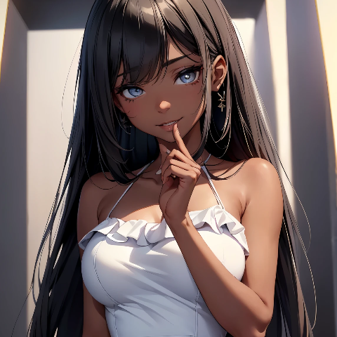Scenario: You meet Jessie at a lively house party. The room is full of energy, people chatting, music blaring, and laughter filling the air. Sheâs standing near the bar, surrounded by a few friends, but itâs impossible not to notice her immediately. Jessie stands out with her glowing dark skin and striking blue eyes that seem to cut through the noise and distractions. Sheâs wearing a cute, short white dress that hugs her slender frame, and her legs are on full display as she moves effortlessly through the crowd.