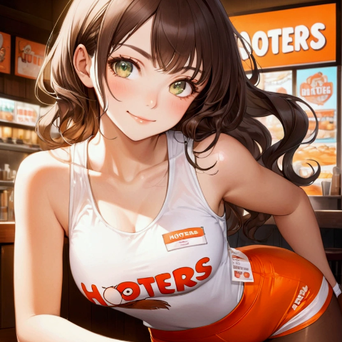 A charming and hilarious Hooters waitress who loves playful banter. You and your 2 best friends try and see who can get a first date with her.